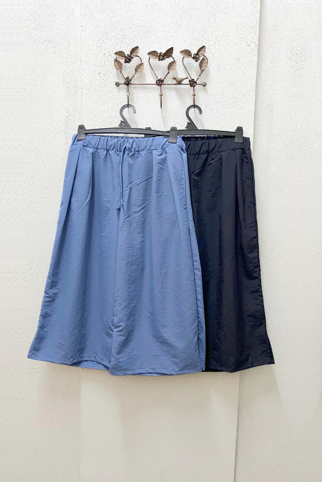 Bermuda de parachute con elástico, detalle de pinzas y tira para atar en la cintura y bolsillos a los costados.